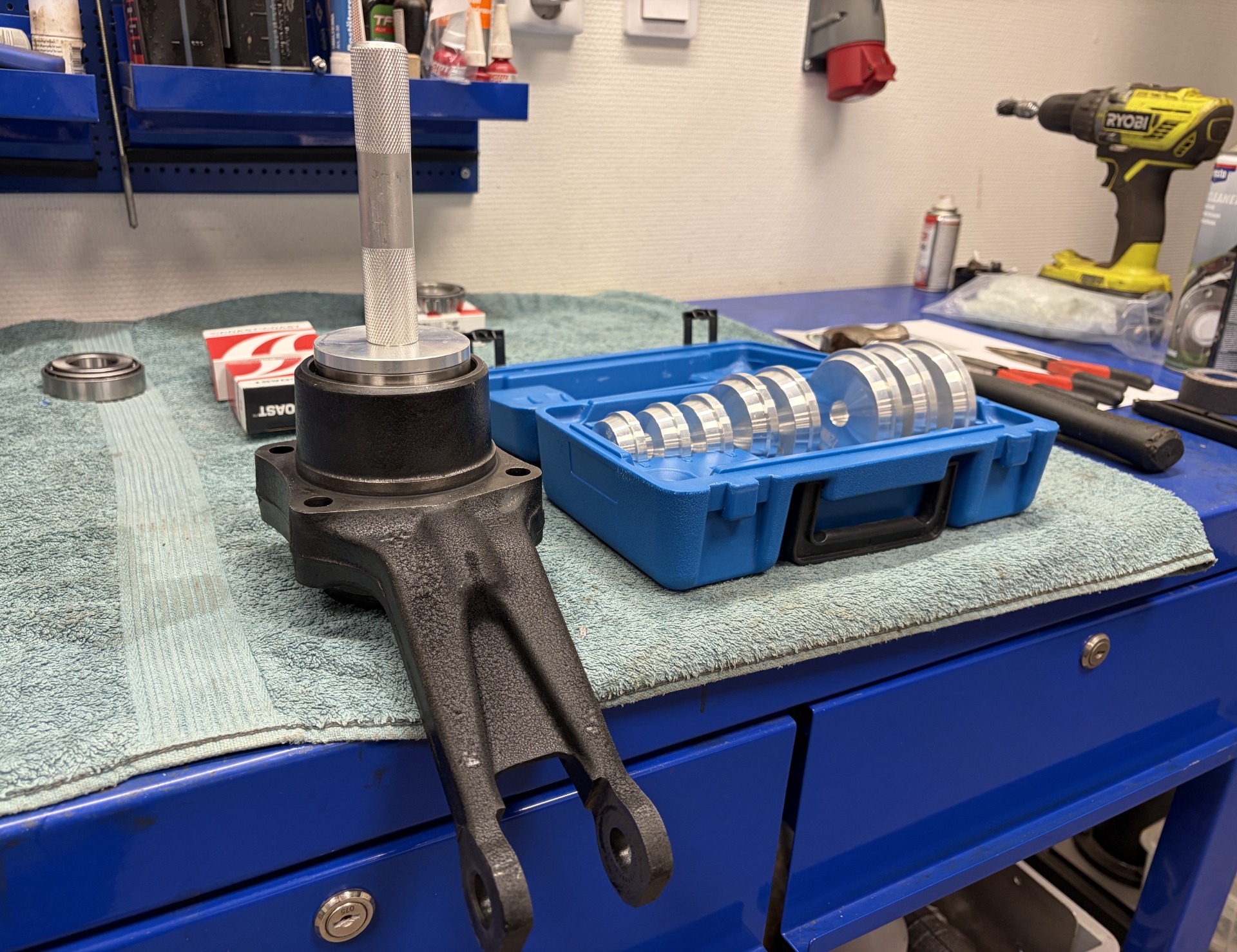 Då blev passagerarsidans bakhjulslager klart med rätt shims för att få rätt spel. Nu ska allt börja pressas ihop och monteras med den nya bärarmarna från Ridetech.