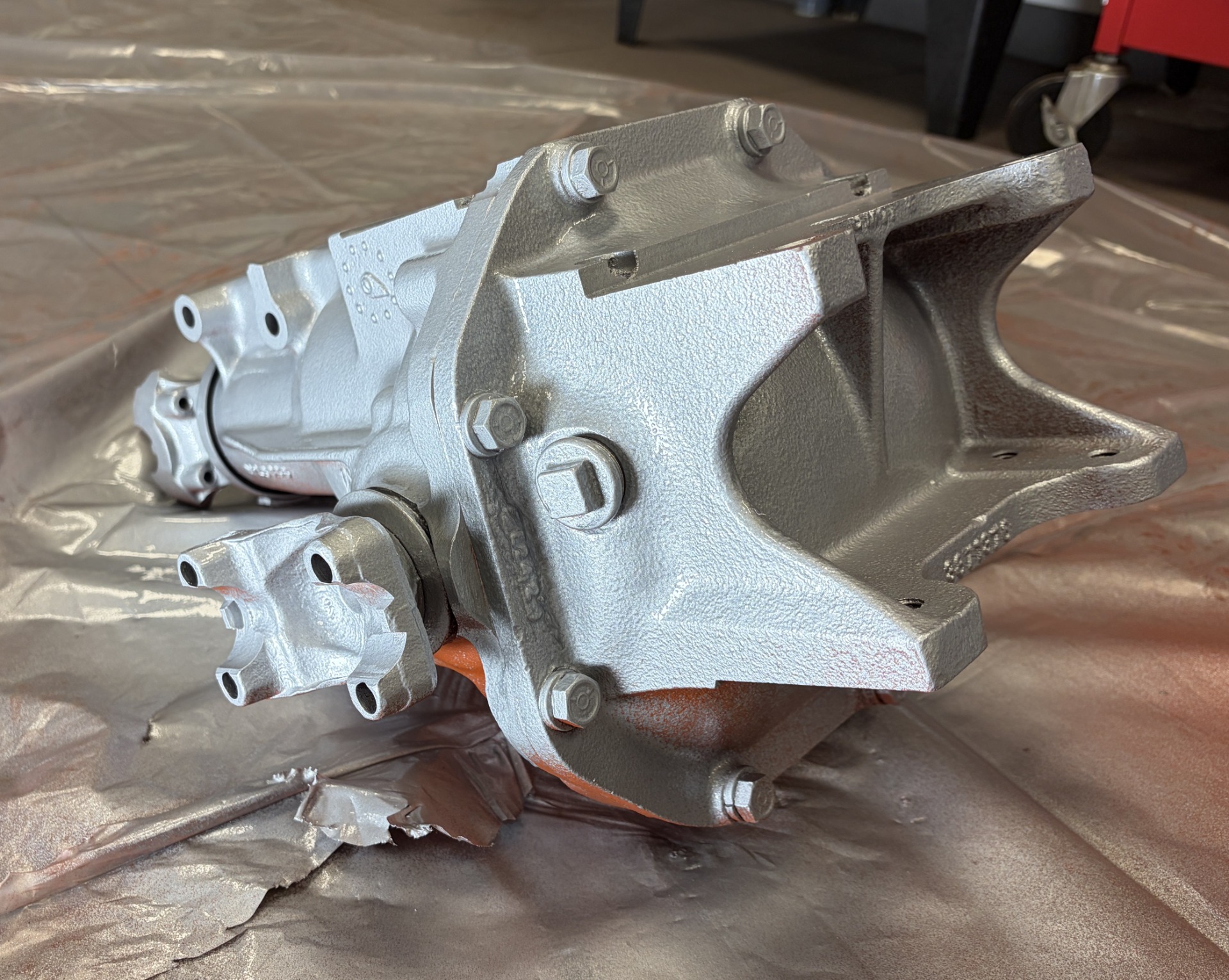 Då var man framme vid ett första lager färg på diffen. Det blir en silver/aluminiumkulör som ser ljus och trevlig ut. Färgen köptes in på Persåkers Speed Shop och den verkar vara av bra kvalité och täcker väldigt bra. Tipset vid beställning var att lägga tunna lager i flera skikt och det var bra med den informationen. Det blev en mycket bra blank yta efter andra lagret färg.